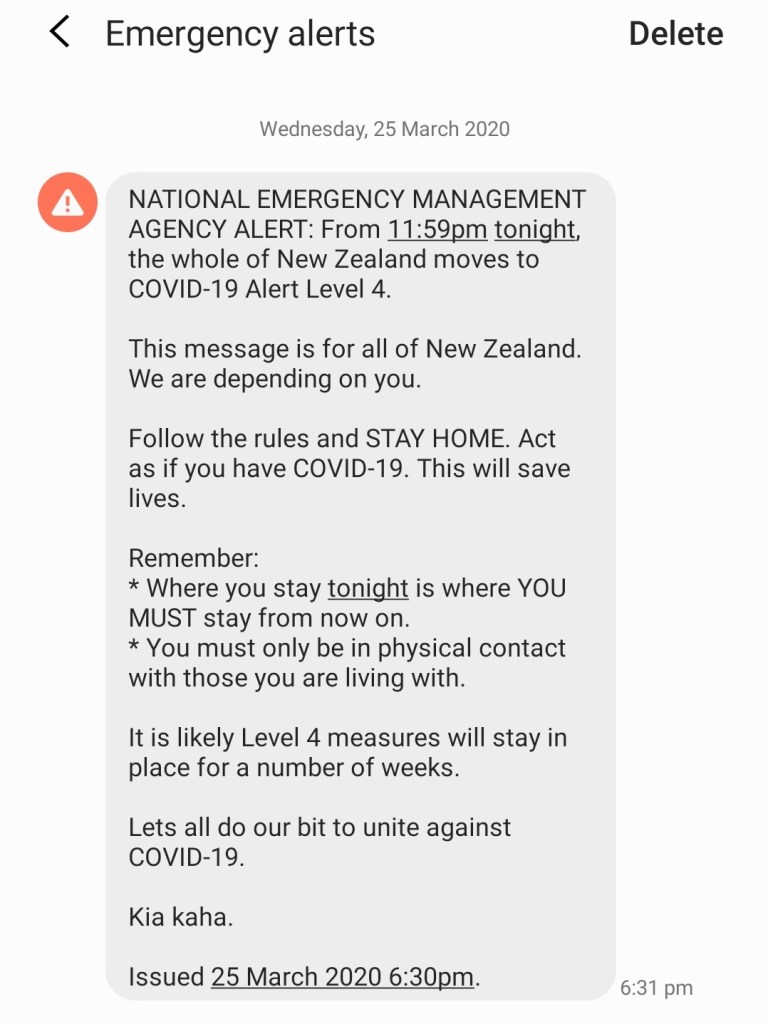 The night before lockdown we received an emergency text message, ending with “Kia kaha” (be strong), the phrase that had been used after the 2011 Christchurch earthquakes, and again after the 2019 mosque attacks. It reinforced the emergency, with the use of te reo Māori to emphasise national unity among the “team of five million.”
