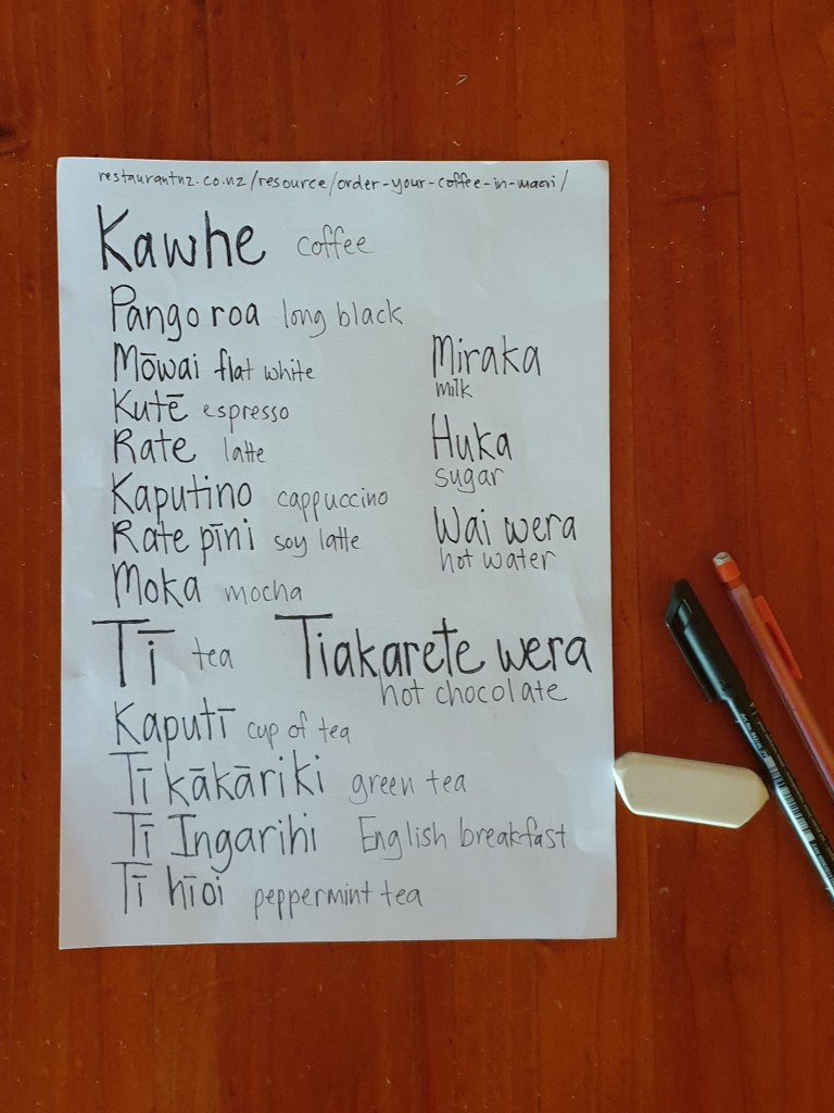 But language is frequently a site of power struggles. That week I was staying in Tūrangi, a town with a high percentage who identify as Māori – 63% compared with 17% nationally (we can choose more than one ethnicity), and 23% who use te reo Māori compared with 4% nationally. I went into a local cafe that afternoon, and ordered my coffee in te reo Māori, translating when I recognised the North American accent of the barista. We chatted and she said she was aware of Māori Language Week but did not know any of the words. I went into teacher mode and, lacking a printer at the motel, I wrote a list and took it back to the cafe. The barista said she would put it up where staff could see it. She liked the fact that I had referenced my source as restaurantnz.co.nz!
