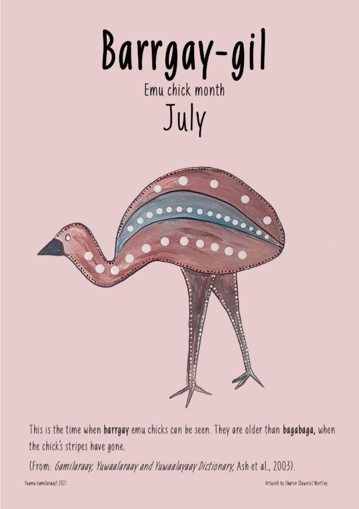 The current Elders in the Winanga-Li dhiiyaan (family) have decided to use those suggestions, as part of our approach to reawakening the traditional language and normalising the use of Gamilaraay for modern life in our centre. To indicate that these are the names of months, a suffix based on gilay (moon) is added to each word, giving Guduu-gil (May), Garriil-gil, Barrgay-gil (July), etc.