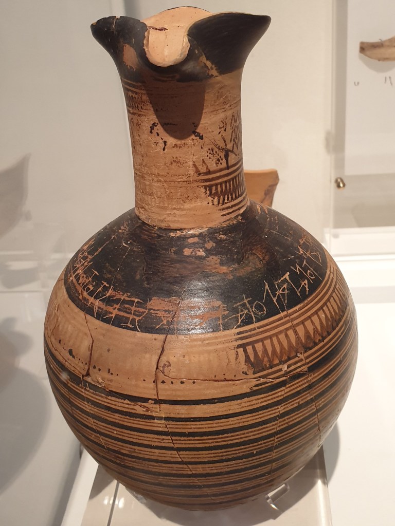 And from centuries again before that, one of the earliest examples of omicron is clearly inscribed on this circa 740 BC wine jug (oinochoe) which I saw in the National Archaeological Museum of Athens. (Although it would not have been called omicron at that stage, before omega was added to the alphabet). Imagine the competition of ‘some festivity unknown to us’ in the museum’s description, leading up to the presentation of this prize jug for ‘the dancer who will now perform more gracefully than all the others’: